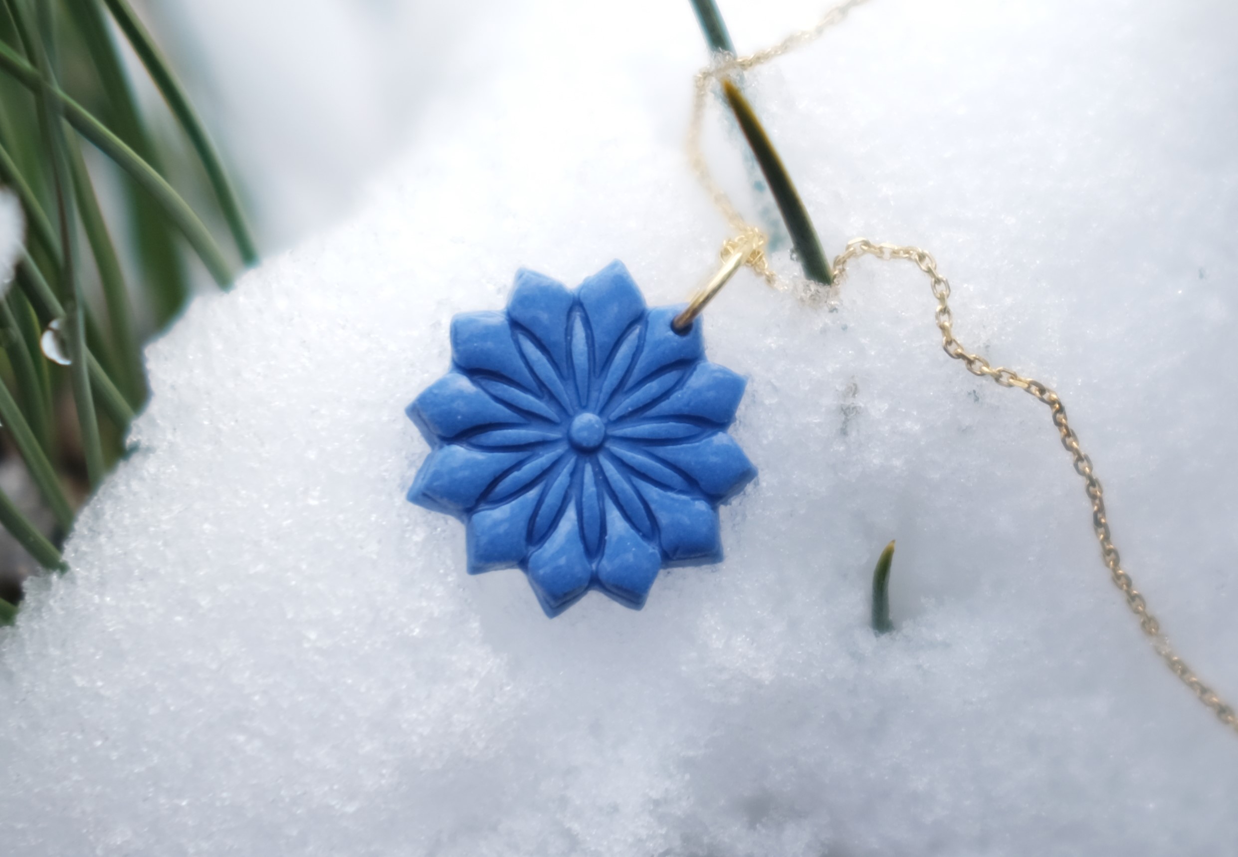 Zimowy naszyjnik śnieżynka z granatowej porcelany na pozłacanym łańcuszku. Materiał:...