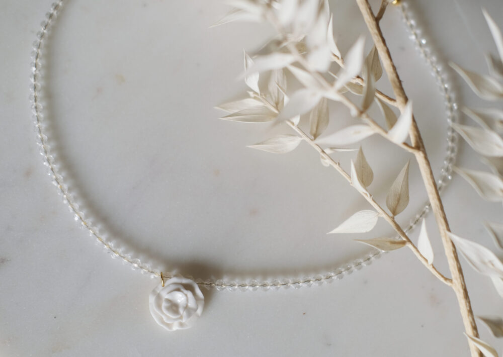 A porcelain rose necklace inspired by a romantic garden on a string of rhinestone beads. Since each rose is made entirely by hand, no two pieces are identical.