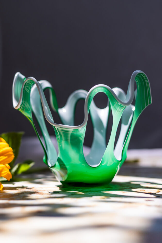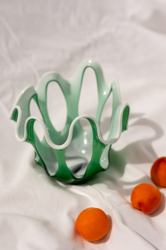 Made of layered glass - the vivid green contrasts with the inner white, creating a depth and chiaroscuro effect. The rim is hand-formed in heat, each piece has a unique arrangement of folds and curves. The bowl can serve both a utilitarian function (such as a fruit or candy platter) and a purely decorative one.