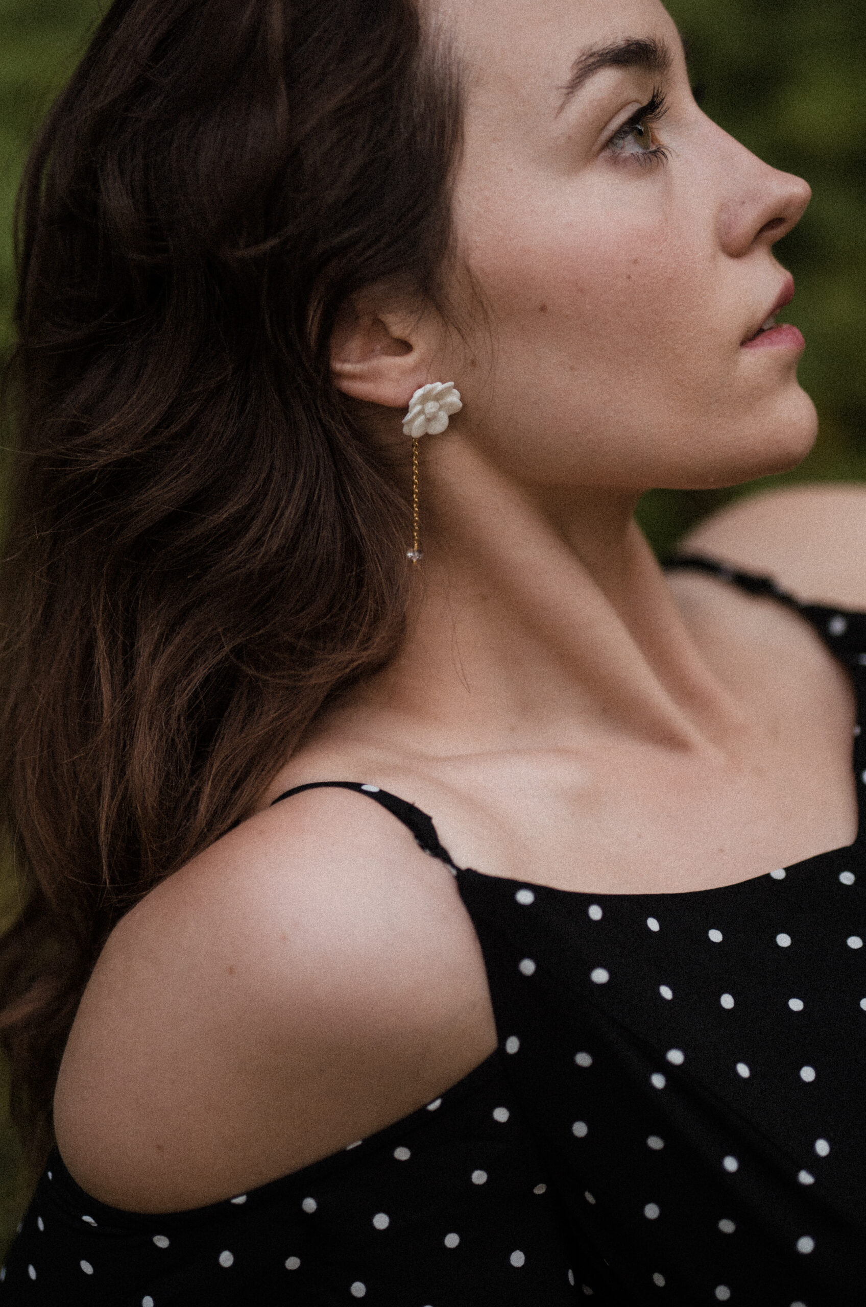 Kolczyki kwiaty z białej porcelany z kryształem górskim. Eleganckie i romantyczne jak wiosenny ogród.