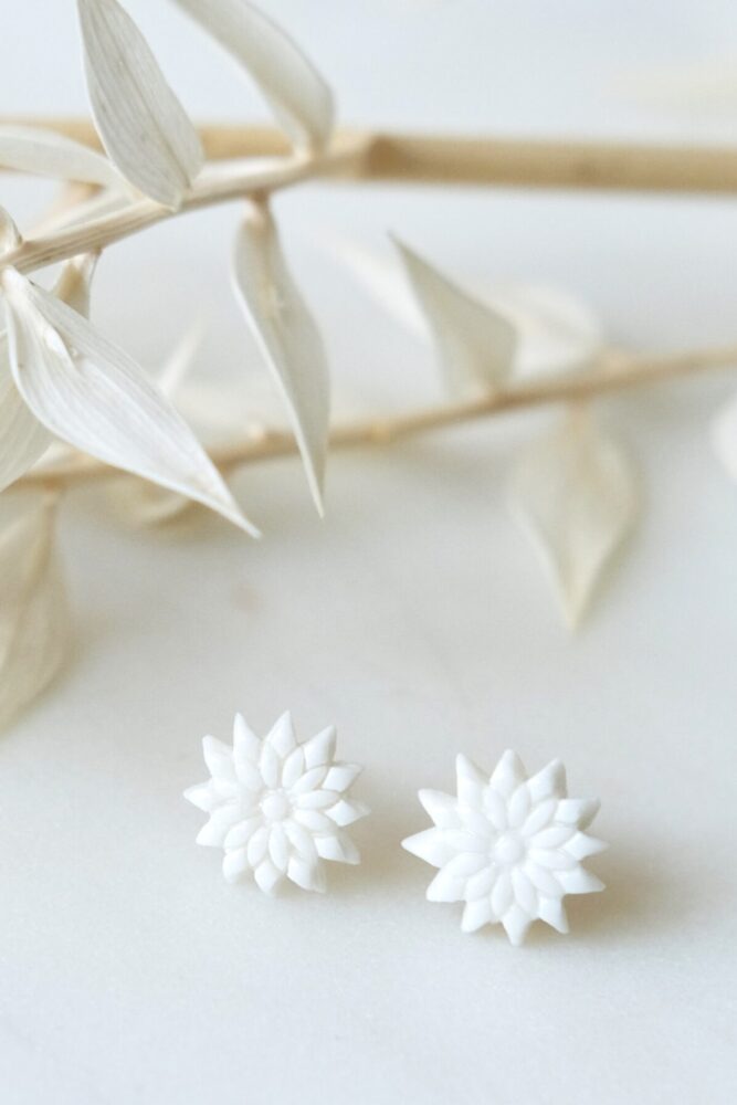 Subtelne kolczyki z białej porcelany kształtem kojarzące się ze słońcem. Wprowadzą optymistyczny, letni nastrój w każdy dzień.