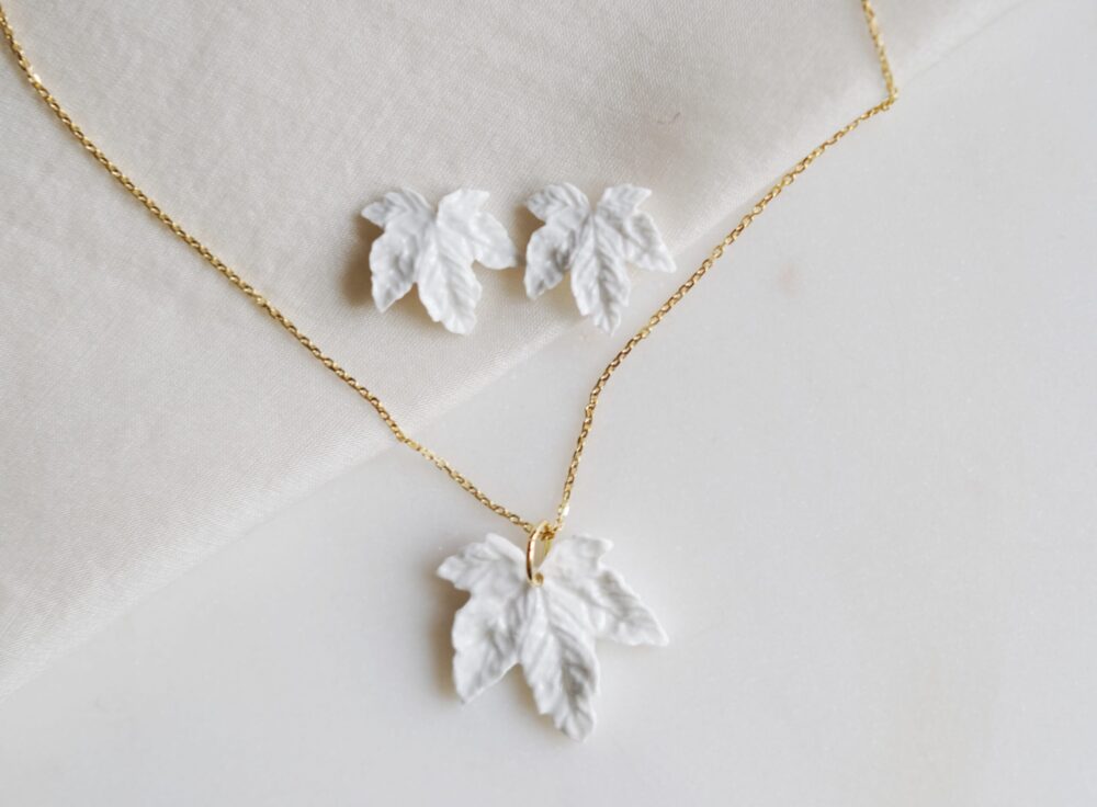 Porcelanowe kolczyki w kształcie liścia klonu przywodzące na myśl spacer w romantycznym parku czy angielskim ogrodzie.