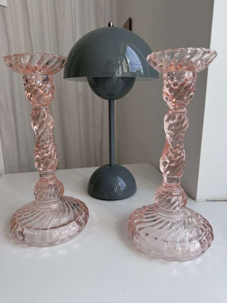 Para świeczników wykonanych ze szkła prasowanego w delikatnym, różowym odcieniu. Smukła forma z dekoracyjnymi spiralnymi żłobieniami oraz szeroka, stabilna podstawa sprawiają, że świeczniki prezentują się elegancko i przyciągają uwagę. Górna misa z tłoczonym wzorem przypominającym muszlę pięknie eksponuje świecę i dopełnia całościowego efektu dekoracyjnego.