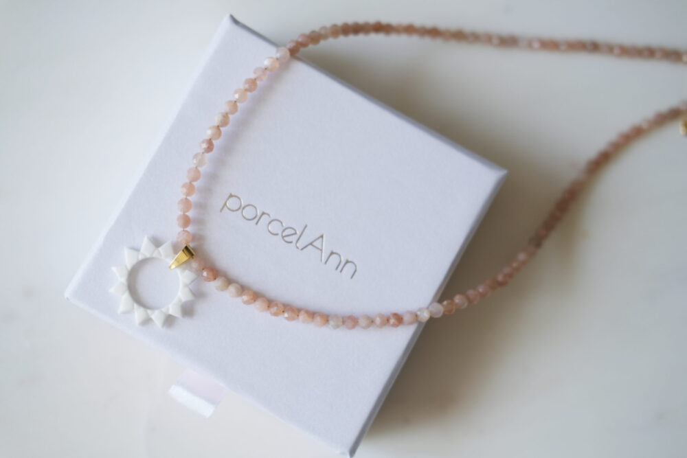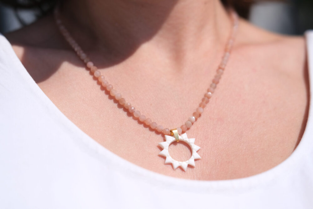 Naszyjnik słońce z białej porcelany na sznurze kamieni słonecznych. Inspirowany ciepłem promieni słonecznych na skórze i wielką mocą tej najbliższej z gwiazd.
