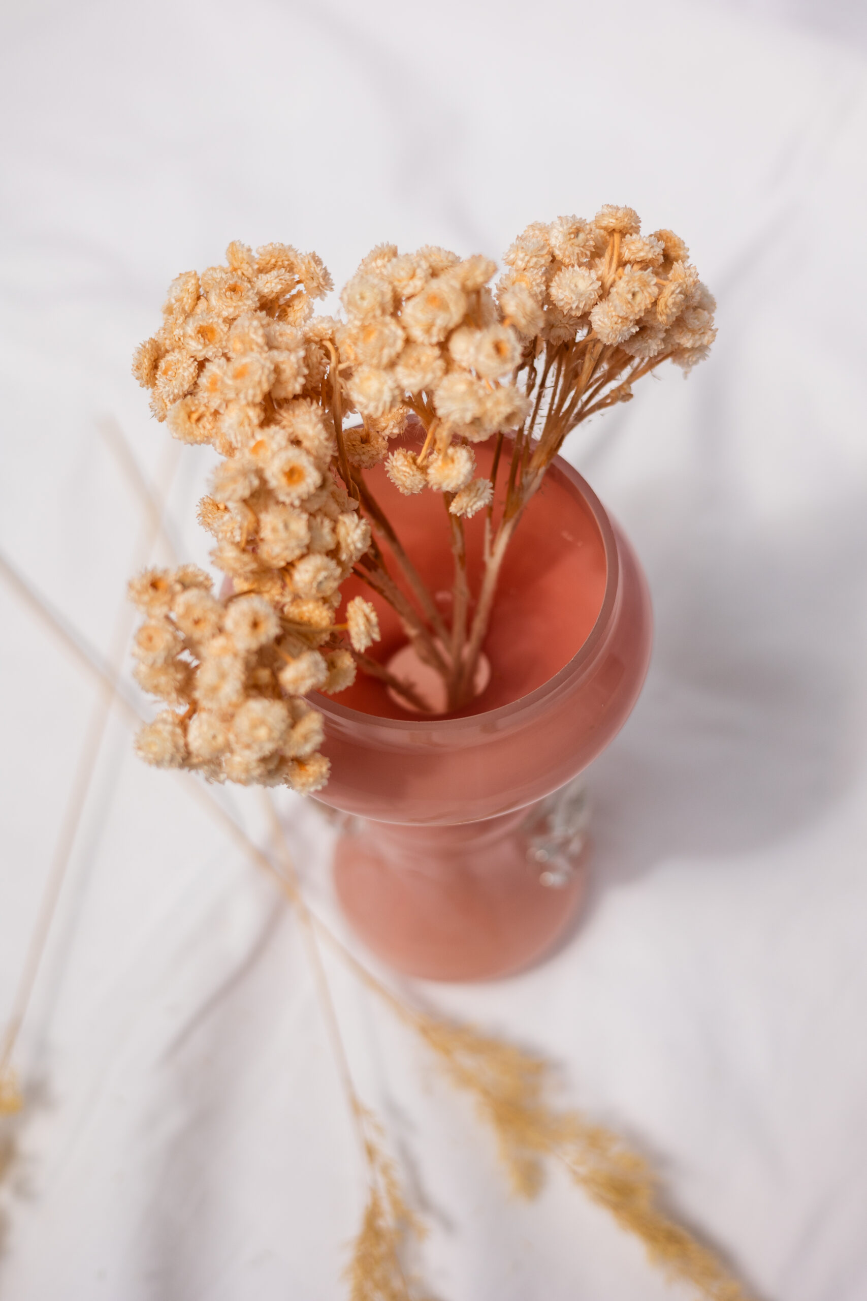 Wykonany ze szkła barwionego w masie, w przyjemnym odcieniu różowo-terakotowym. Posiada typowy dla Tarnowca balasowy kształt z plastycznymi „uszkami” po bokach, które nadają mu rzeźbiarskiego wyrazu. Może być używany zarówno jako świecznik, jak i mini wazonik do suchych bukietów (jak na zdjęciu).