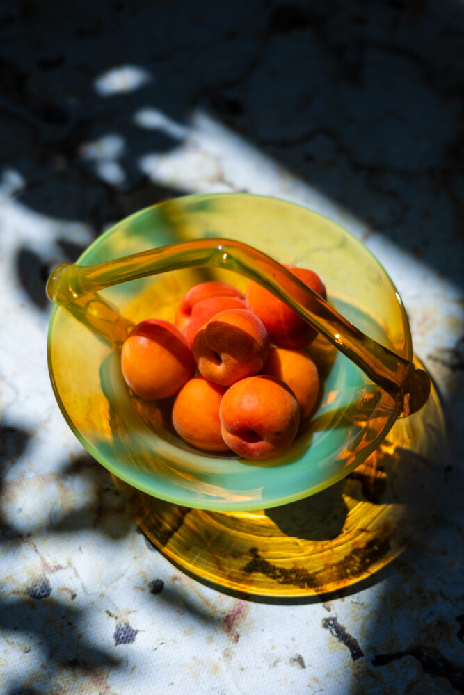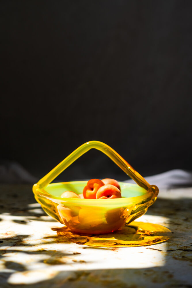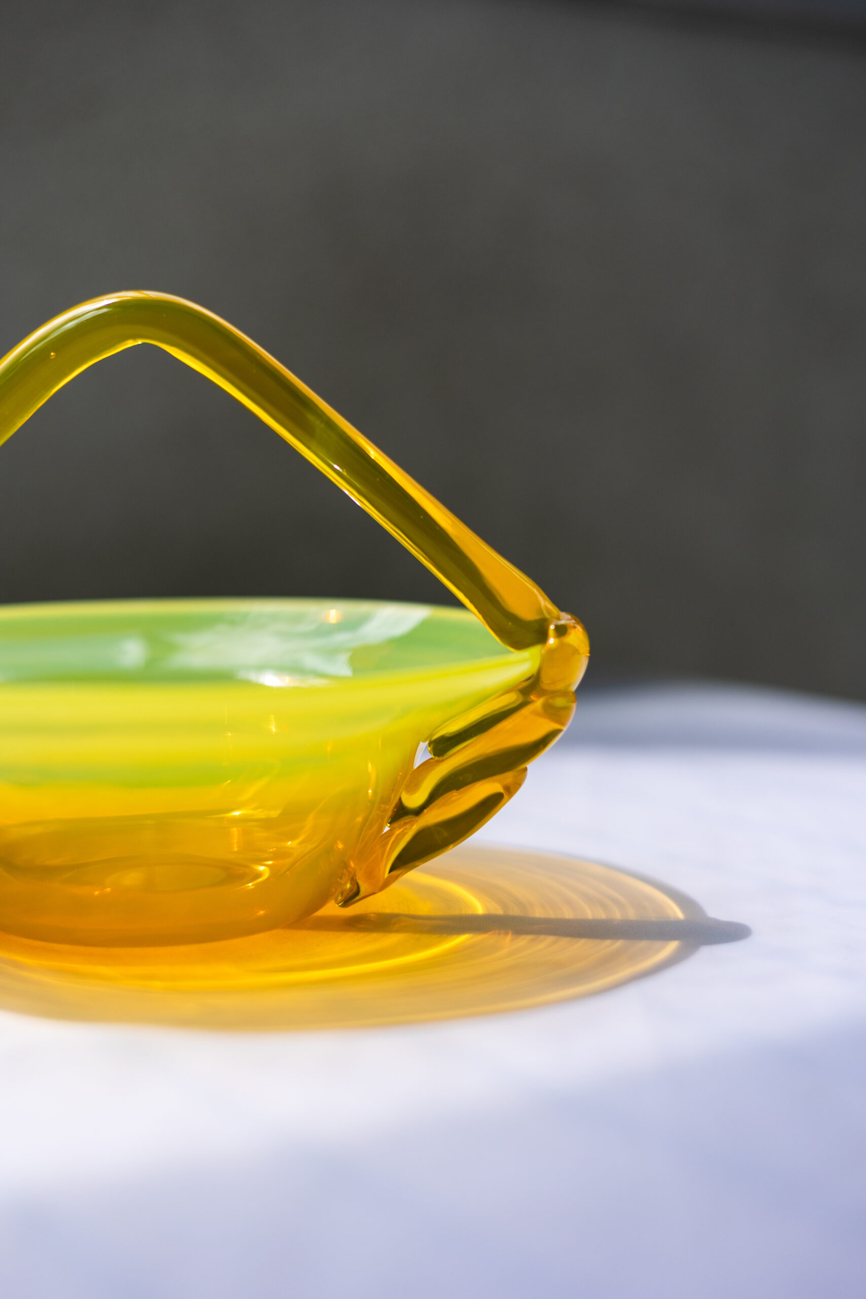 Wyróżnia się pięknym, ręcznie formowanym uchwytem oraz subtelnym przejściem kolorów – od soczystej żółci po delikatną zieleń, tworząc efekt przypominający szkło uranowe, choć bez zawartości uranu. To wyjątkowy przykład polskiego designu użytkowego z epoki PRL, łączącego funkcjonalność z dekoracyjnym charakterem.