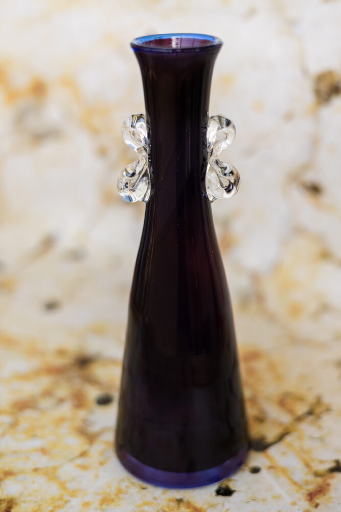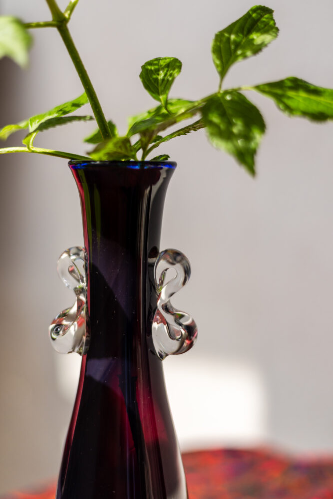 Smukły wazon o zwężającej się ku górze, eleganckiej formie, wykonany ręcznie w Hucie Szkła Tarnowiec w latach 70. lub 80. XX wieku. Utrzymany w ciemnym, nasyconym odcieniu bordo z odgraniczonym granatowym rantem (unikatowe połączenie kilku warstw szkła), z dekoracyjnymi, przejrzystymi uchwytami po bokach – charakterystycznymi dla tej huty.