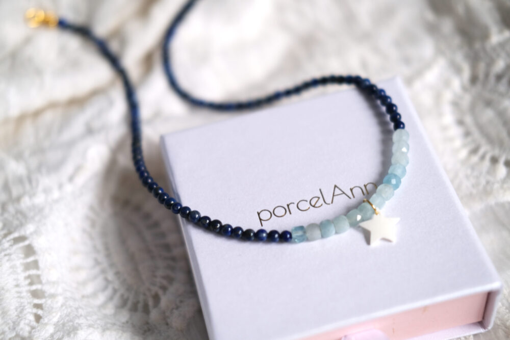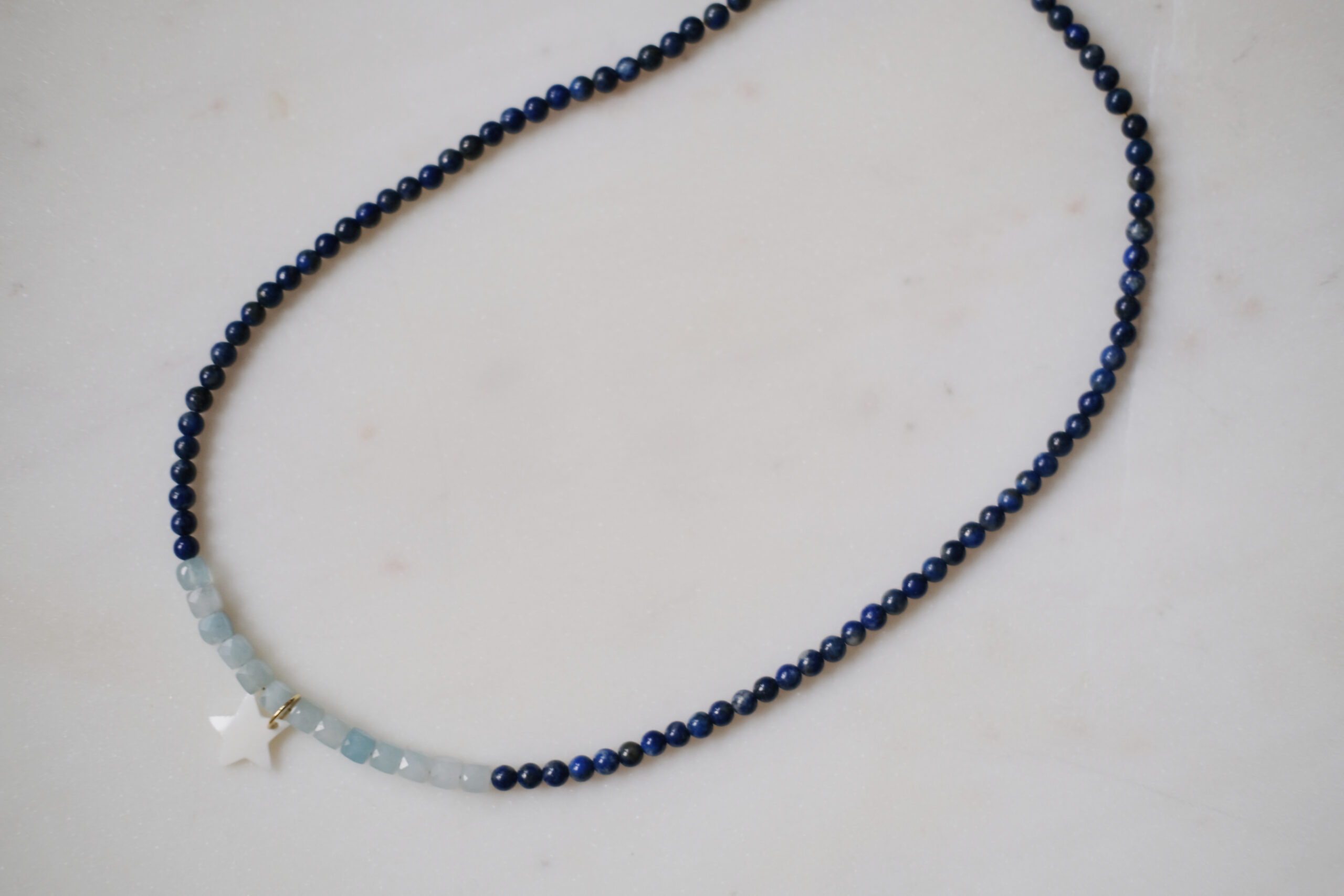 Naszyjnik gwiazda z białej porcelany z akwamarynem i lapisam lazuli. Akwamaryn przypomina drobinki lodu w mroźny poranek a lapis lazuli nocne niebo.